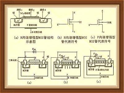 在一塊摻雜濃度較低的P型硅襯底上,制造兩個(gè)高摻雜濃度的N+區(qū),并用金屬鋁引出兩個(gè)電極,別離作漏極d和源極s。然后在半導(dǎo)體外表掩蓋一層很薄的二氧化硅(SiO2)絕緣層,在漏——源極間的絕緣層上再裝上一個(gè)鋁電極,作為柵極g。在襯底上也引出一個(gè)電極B,這就構(gòu)成了一個(gè)N溝道增強(qiáng)型MOS管。MOS管的源極和襯底通常是接在一同的(大多數(shù)管子在出廠前已聯(lián)接好)。它的柵極與其它電極間是絕緣的。圖(a)、(b)別離是它的構(gòu)造示意圖和代表符號(hào)。代表符號(hào)中的箭頭方向標(biāo)明由P(襯底)指向N(溝道)。P溝道增強(qiáng)型MOS管的箭頭方向與上述相反,如圖(c)所示。