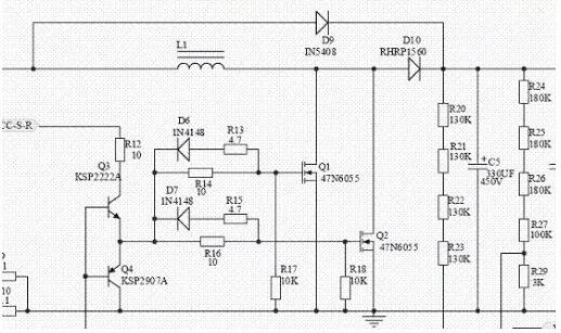 圖1所示;是三星V2屏等離子開關(guān)電源的PFC激勵部分。從圖中可以看出;這是一個并聯(lián)開關(guān)電源L1是儲能電感,D10是這個開關(guān)電源的整流二極管,Q1、Q2是開關(guān)管,為了保證PFC開關(guān)電源有足夠的功率輸出,采用了兩只MOS管Q1、Q2并聯(lián)應(yīng)用(圖2所示;是該并聯(lián)開關(guān)電源等效電路圖,圖中可以看出該并聯(lián)開關(guān)電源是加在整流橋堆和濾波電容C5之間的),圖中Q3、Q4是灌流激勵管,Q3、Q4的基極輸入開關(guān)激勵信號, VCC-S-R是Q3、Q4的VCC供電(22.5V)。