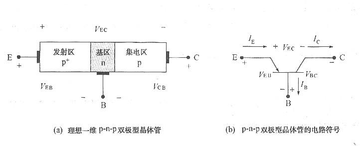 圖5.2(a)為理想的一維結(jié)構(gòu)p-n-p雙極型晶體管,具有二段不同摻雜濃度的區(qū)域,形成兩個(gè)p-n結(jié),濃度最高的p+區(qū)域稱為發(fā)射區(qū)(在圖5.2中以E定義);中間較窄的n型區(qū)域,其雜質(zhì)濃度中等,稱為基區(qū)(base,定義為B),基區(qū)的寬度需遠(yuǎn)小于少數(shù)載流子的擴(kuò)