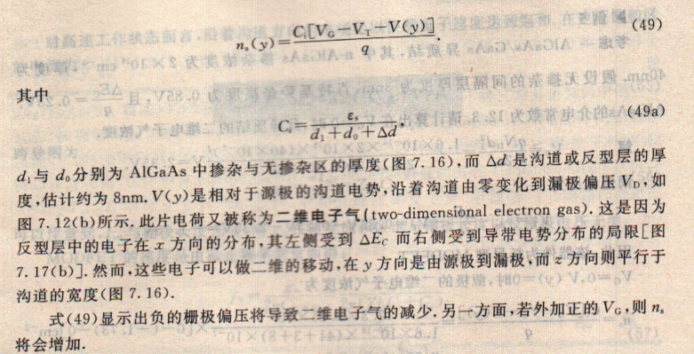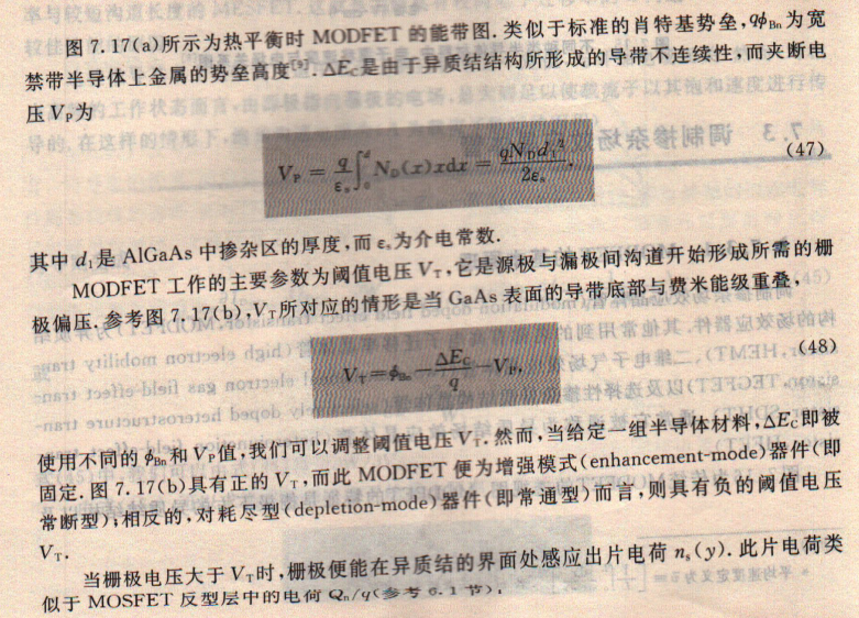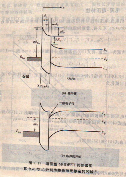 圖7,1、6為傳統(tǒng)MODFET的透視圖.MODFET的特征是柵極下方的異質(zhì)結(jié)結(jié)構(gòu)以及調(diào)制摻雜層,對于圖7:.16中的器件來說.AIGaAs為一寬禁帶半導體,而GaAs則為窄禁帶半導體.這兩種半導體是被調(diào)制摻雜的,也就是說,除了在極窄的區(qū)域如中并無摻雜外