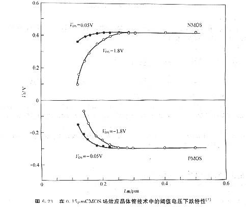 6.3.1 短溝道效應(short-channel effect)式(45)中的閾值電壓是基于6.2,l節(jié)中的突變溝道近似推導得出的,也即襯底耗盡區(qū)內(nèi)的電荷僅由柵極電壓產(chǎn)生的電場所感應出.換言之,式(45)中的第三項與源極到漏極間的橫向電場無關.但是隨著溝道長度的縮減,源極與漏極問的電場將會影響電荷散布、閾值電壓控制以及器件漏電等器件特性,