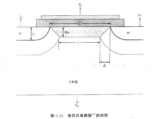 當溝道的邊緣效應變得不可疏忽時,隨著溝道的縮減,n溝道MOSFET的閾值電壓通常會變得不像原先那么正,而關于p溝道MOSFET而言,則不像原先那么負,圖6.23顯現(xiàn)了在VDS=o.05V時VT下跌的現(xiàn)象.閾值電壓F跌可用如圖6.24所示的電荷共享(chargesharing)模型來加以解釋,此圖為一個n溝道MOSFET的剖面圖,且器件工作在線性區(qū)(VDs≤o.1V),因而漏極結(jié)的耗盡區(qū)寬度簡直與源極結(jié)相同.由于溝道的耗盡區(qū)與源極和漏極的耗盡區(qū)堆疊,由柵極偏壓產(chǎn)生的電場所感應生成的電荷可用這梯形區(qū)域來近似同等.