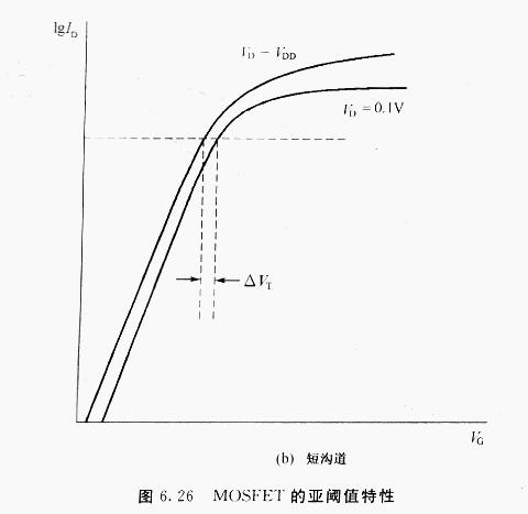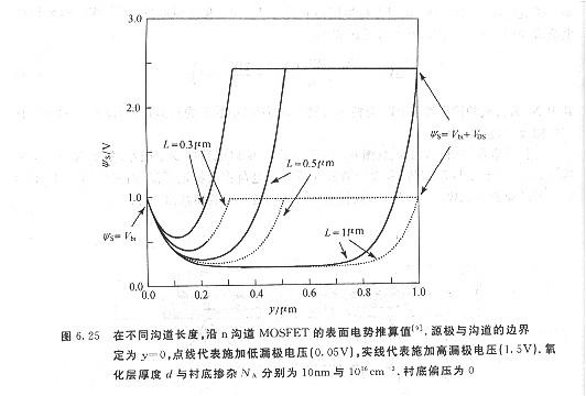 當短溝道MOSFET的漏極電壓由線性區(qū)增至飽和區(qū)時,其閾值電壓下跌將更嚴重(如圖6.23所示).此效應稱為舞場感應勢壘降落.數(shù)個不同溝道長度的n溝道器件的源極與漏極間的外表電勢如圖6.25所示,點線為VDS=o,實線為VDS>o.當柵極電壓小于VT時,p—型硅襯底在n+源極與漏極問構(gòu)成一勢壘,并限制電子流由源極流向漏極.對工作在飽和區(qū)的器件而言,漏極結(jié)的耗盡區(qū)寬度遠大于源極結(jié),在長溝道的例子中,增加漏極結(jié)耗盡區(qū)寬度并不會影響勢壘高度(參閱圖6.25中l(wèi)μm的例子).但當溝道長度足夠短時,漏極電壓的增加將減小勢壘高度(圖6.25中o.3μm與o.5μm的例子),此歸因于漏極與源極太接近所形成的外表區(qū)的電場浸透,此勢牟降低效應會招致電子由源極注入漏極,形成亞閾值電流的增加.因而在短溝道器件中,閡值電壓會隨漏極電壓增加而降低.