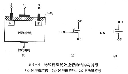 絕緣柵型場效應(yīng)管的特性是輸人電阻高,便于做成集成電路。在一塊N型硅片上有兩個相距很近濃度很高的P擴(kuò)散區(qū),分別為源極和漏極。在源區(qū)與漏區(qū)之間的硅片上,有一層絕緣二氧化硅,絕緣層上掩蓋著金屬鋁,這就是柵極。柵極和其他電極之間是絕緣的,所以稱為絕緣柵型場效應(yīng)管。由于源、柵之間有一層氧化層,這種管子根本上沒有柵極電流,因而輸入阻抗十分高。圖6-4所示為絕緣柵型場效應(yīng)管的構(gòu)造與場效應(yīng)管符號。