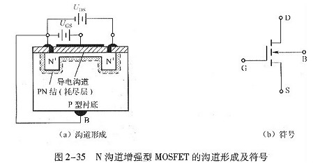 N溝道加強(qiáng)型MOSFET的溝道構(gòu)成及符號如圖2-35所示,其中圖2-35 (a)所示是在一塊雜質(zhì)濃度較低的P型半導(dǎo)體襯底上制造兩個高濃度的N型區(qū),并分別將它們作為源極s和漏極D,然后在襯底的外表制造一層Si02絕緣層,并在上面引出一個電極作為柵極G。圖2-35(b)所示是其在電路中的符號。