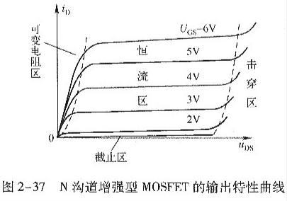 N溝道MOS管的輸出特性曲線如圖2-37所示。與結(jié)型場效應(yīng)管的輸出特性相似,它也分為恒流區(qū)、叮變電阻區(qū)、截止區(qū)和擊穿區(qū)。其特性如下所示。