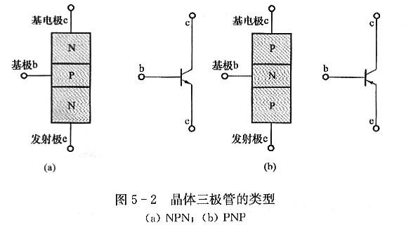 晶體三極管是一種具有兩個(gè)PN結(jié)(集電結(jié)、發(fā)射結(jié))、三個(gè)電極(發(fā)射極、基極、集電極)、三個(gè)區(qū)(發(fā)射區(qū)、基區(qū)、集電區(qū))的半導(dǎo)體器件。按所用半導(dǎo)體材料的不同可分為鍺管和硅管;按截止頻率可分為超高頻管、高頻管(≥3MHz)和低頻管(<3MHz);按耗散功率可分為小功率管(<1W)和大功率管(≥1W);按用途可分為低頻放大管、高頻放大管、開(kāi)關(guān)管、低噪聲管、高反壓管、復(fù)合管等,按PN結(jié)的構(gòu)成不同有NPN、PNP兩種類(lèi)型,如圖5-2所示。