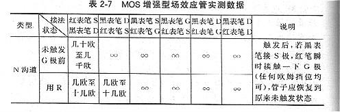 關(guān)于MOS增強(qiáng)型場效應(yīng)管,丈量數(shù)據(jù)見表2-7。至于MOS耗盡型場效應(yīng)管,平常柵極不允許開路,普通不作業(yè)余測量。