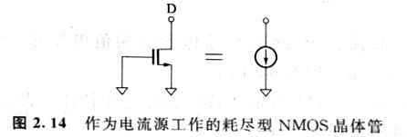 耗盡型晶體管對于模擬電路設計來說是一種很方便的器件。例如,使用耗盡型晶體管的1V以下的電源電壓下工作的rail to rail工作的OP放大器。另外,如圖2. 14所示,柵極和源極接地的耗盡型NMOS晶體管可以作為電流源使用。由于VGS=o,所以漏極電流可以表示為