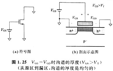 下面以NMOS晶體管為例,討論MOS晶體管處于導(dǎo)通狀態(tài)時(shí)的溝道厚度。圖1.25中,假如源極、漏極的電位都是OV,則VGS=VGD。這時(shí),假如VGS>VT,那么,如圖1. 25 (b)所示,在源區(qū)與漏區(qū)之間會(huì)構(gòu)成厚度平均的溝道。