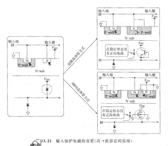 如圖13. 21所示,用晶體管的擊穿特性交流二極管的正向特性,去掉從輸入到VDD線的電流途徑。作為維護(hù)電路,也能夠吸收比VDD線的電壓電平更高的正的外來(lái)浪涌。當(dāng)然,這個(gè)擊穿電壓應(yīng)該設(shè)計(jì)得比IC內(nèi)部的初級(jí)輸入柵耐壓低。