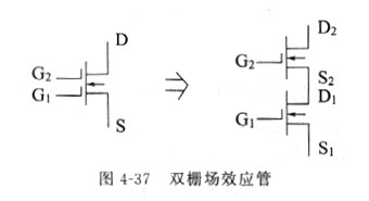 雙柵場效應管的特性是具有兩個相互獨立的柵極G1和G2,從構造上看相當于兩個單柵場效應管的串聯體,如圖4-37所示。
