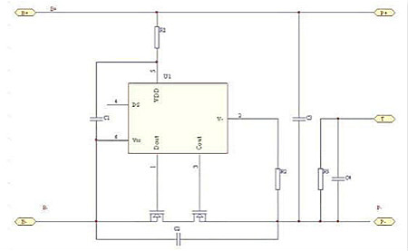 保護板有兩個核心部件:一塊保護IC,它是由精確的比較器來獲得可靠的保護參數(shù);另外是MOSFET串在主充放電回路中擔當高速開關(guān),執(zhí)行保護動作。電路原理圖如下: