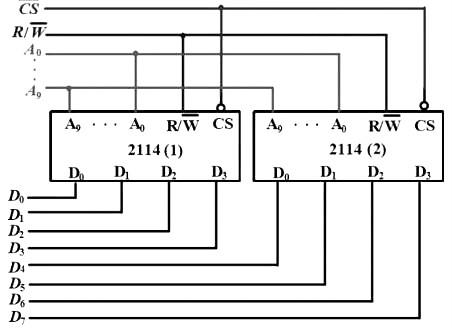 例:用2片2114(1024×4bit)RAM構成1024×8bit的RAM