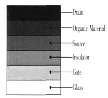 圖2是垂直溝道OFET結(jié)構(gòu),是以縮短溝道長(zhǎng)度為目的的一類新型場(chǎng)效應(yīng)晶體管。它以半導(dǎo)體層為溝道長(zhǎng)度,依次蒸鍍漏-源-珊電極,通過改變柵電壓來控制源、漏電極的電流變化。