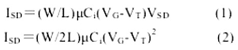 其中,Vr是閾值電壓,Ci是絕緣層單位面積的電容,u是載流子遷移率。當(dāng)Va大于閾值電壓且固定在某-一數(shù)值時(shí),Vsp很?。▅Vspl《|VG-VT),此時(shí),導(dǎo)電溝道中的電荷密度是線性減少,有機(jī)場(chǎng)效應(yīng)晶體管處于線性工作區(qū),漏電流可以通過方程式
