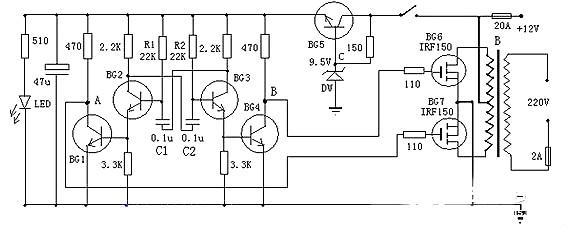 這是一款非常容易制作的逆變器,可以將12V電源電壓變為220V市電,電路由BG2和BG3組成的多諧振蕩器推動,再通過BG1和BG2驅動,來控制BG6和BG7工作。