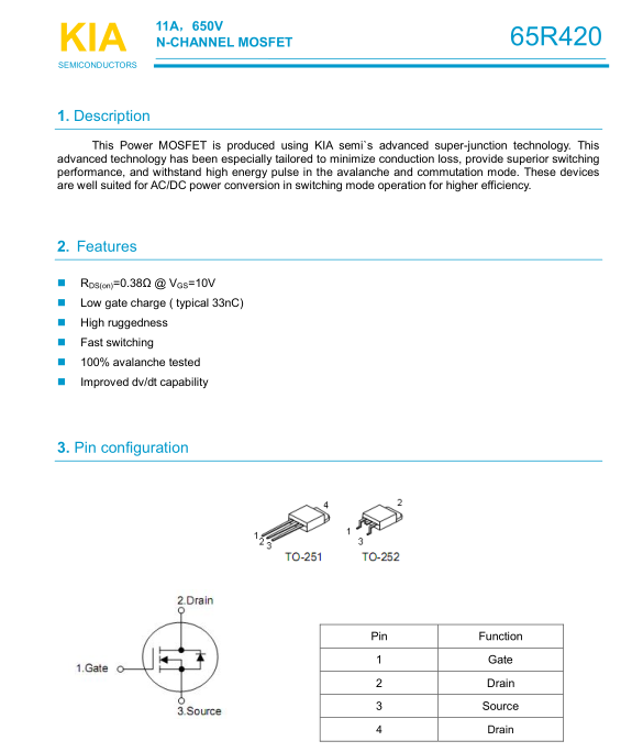 參數: ID(A): 11 BVDSS(V): 650 RDS(ON): 0.38 Qg(nC): 33 Package: TO-251、252