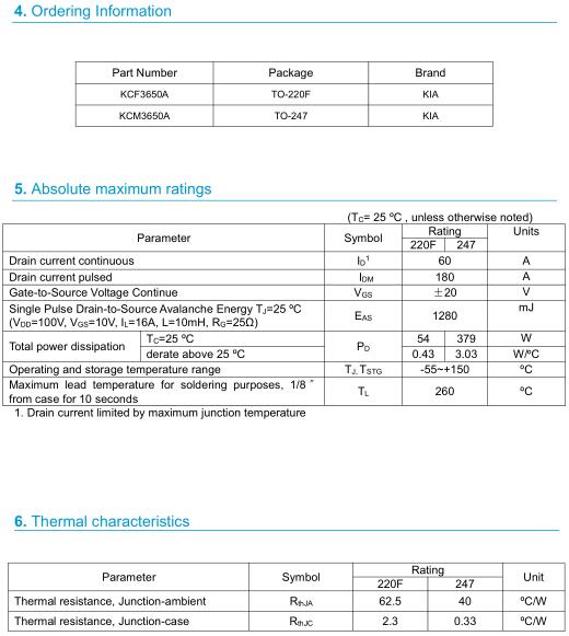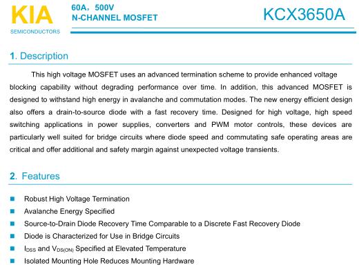 參數: ID(A): 60 BVDSS(V): 500 RDS(ON): 0.056 Qg(nC): 66 Package: TO-220F、247