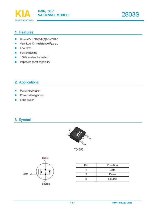 參數: ID(A): 150 BVDSS(V): 30 RDS(ON): 2.1 Qg(nC): 112 Package: TO-252
