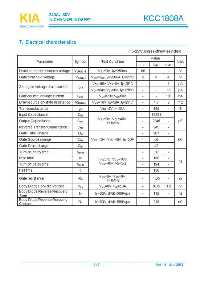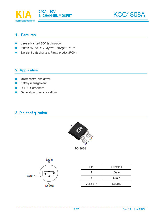 參數: ID(A): 240 BVDSS(V): 80 RDS(ON): 1.7mΩ Qg(nC): 207 Package: TO-263-6L
