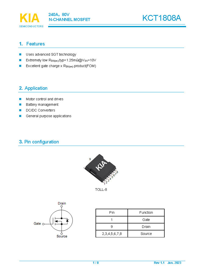 參數: ID(A): 240    BVDSS(V): 80    RDS(ON): 1.25mΩ    Qg(nC): 205    Package: TOLL-8