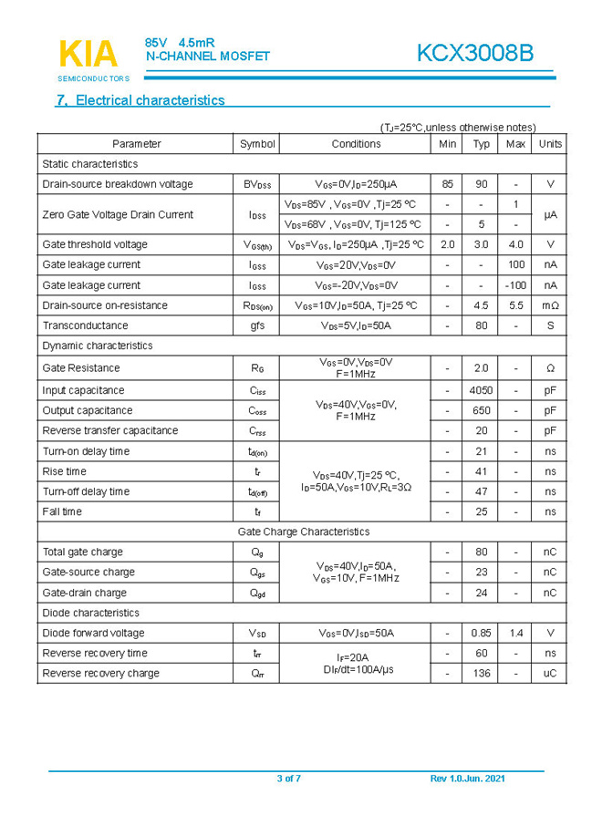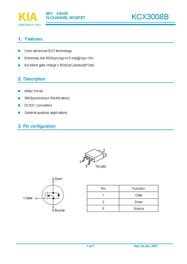 參數: ID(A): 160 BVDSS(V): 85 RDS(ON): 4.5mΩ Qg(nC): 80 Package: TO-263