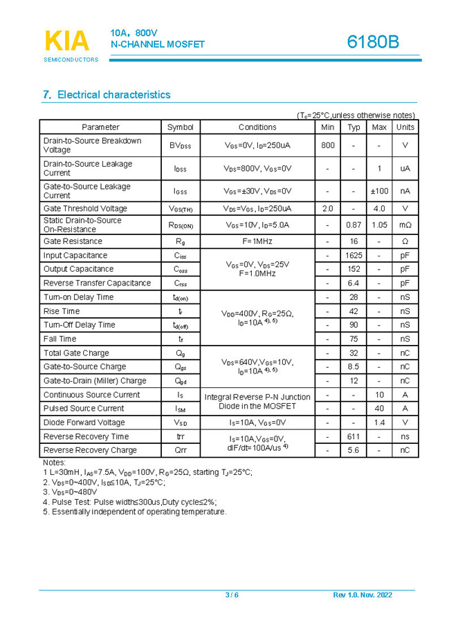參數: ID(A): 10 BVDSS(V): 800 RDS(ON): 0.87Ω Qg(nC): 32 Package: TO-220F