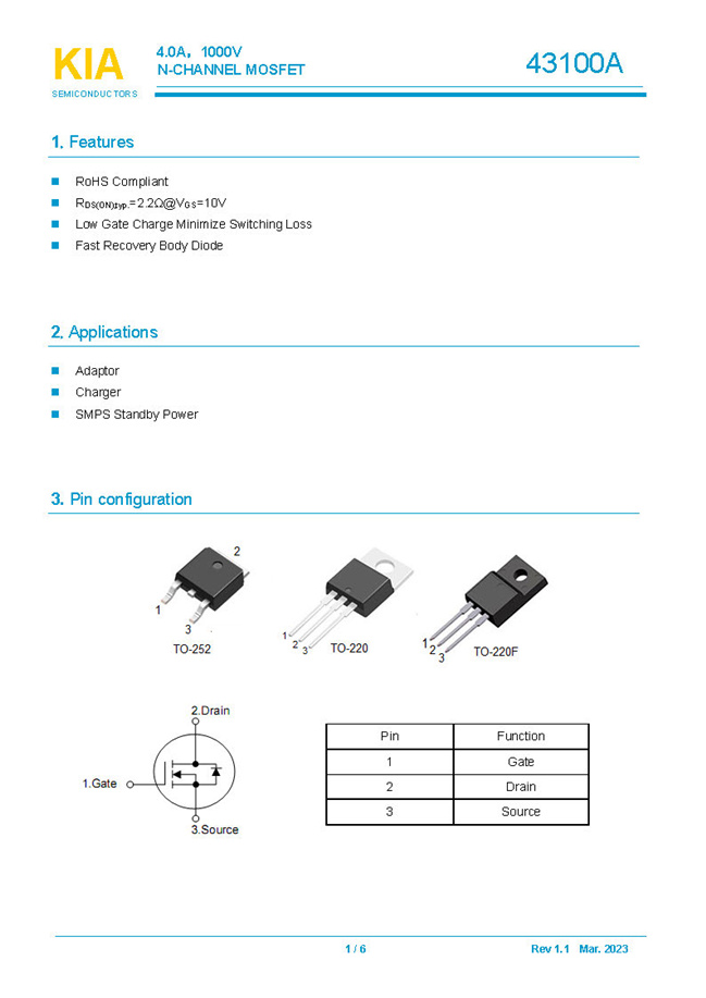 參數: ID(A): 4 BVDSS(V): 1000 RDS(ON): 2.2Ω Qg(nC): 36 Package: TO-252.TO-220.TO-220F