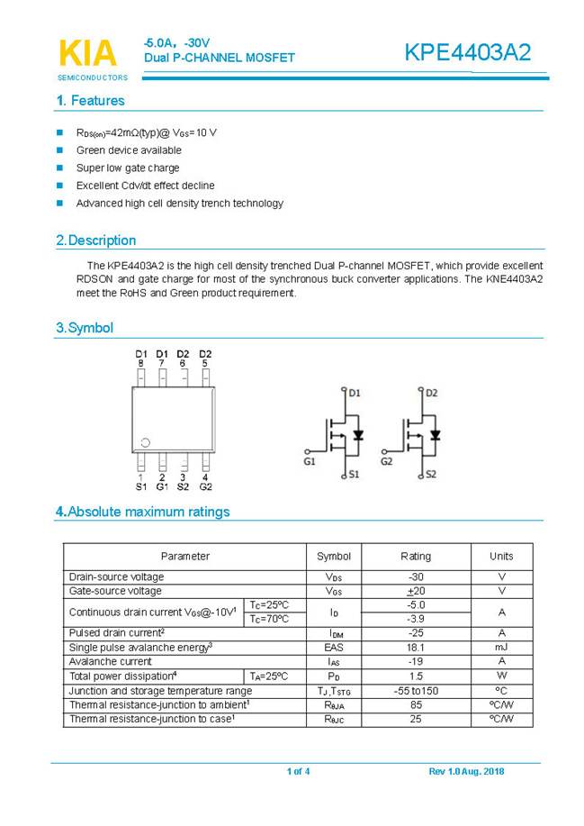 參數: ID(A): -5    BVDSS(V): -30    RDS(ON): 42mΩ    Qg(nC): 6.5    Package: SOP-8