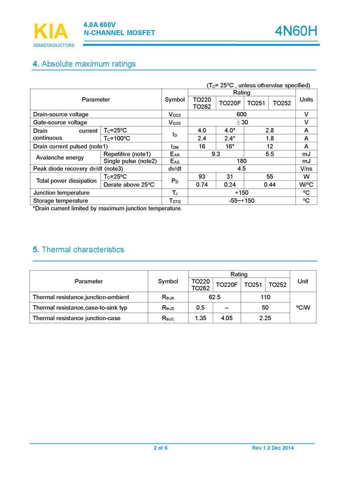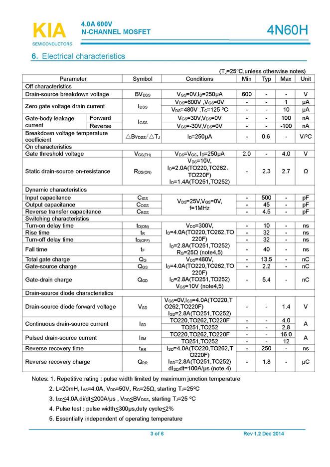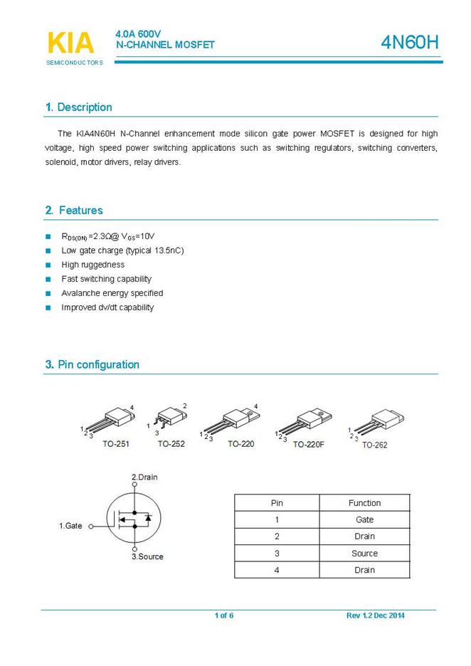 參數: ID(A): 4    BVDSS(V): 600    RDS(ON): 2.7    Qg(nC): 13.5    Package: TO-251、TO-252、TO-220、TO-220F、TO-262
